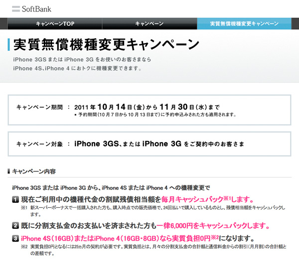 ソフトバンクモバイル株式会社は、iPhone 3GS/3GからiPhone 4S/4に機種変更するユーザーに向けたキャッシュバックのサービス「実質無償機種変更キャンペーン」の内容を一部修正した。この変更により、既にiPhone 3GS/3Gの端末代金を支払い済みのユーザーが対象として追加されている。