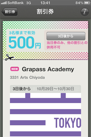 なお、割引券の切り取り操作は、データがダウンロードされていれば、電波が入らないところでも使用が可能。美術館の展覧会情報は常に最新のものに更新され、割引券も毎週更新される。過去に行った展覧会の記録もできるようになっている。 そのほか、併設カフェでの割引など、期間限定の企画も登場する。
