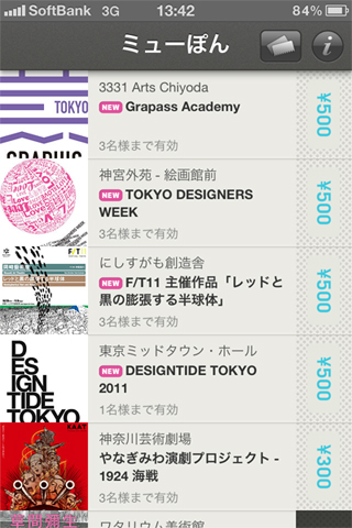 ミューぽんは、iPhoneで「持ち歩く」割引券。ミューぽんを購入すると、いつでも展覧会の情報をチェックすることが可能なほか、美術館の割引券を一覧でき、好きな割引券をどれでも1回ずつ使うことができる。また、2名、3名まで使える割引券もあるので、Twitterとの連携や友達へのお知らせ機能などにより、展覧会を起点としたコミュニケーションツールとしても便利だろう。