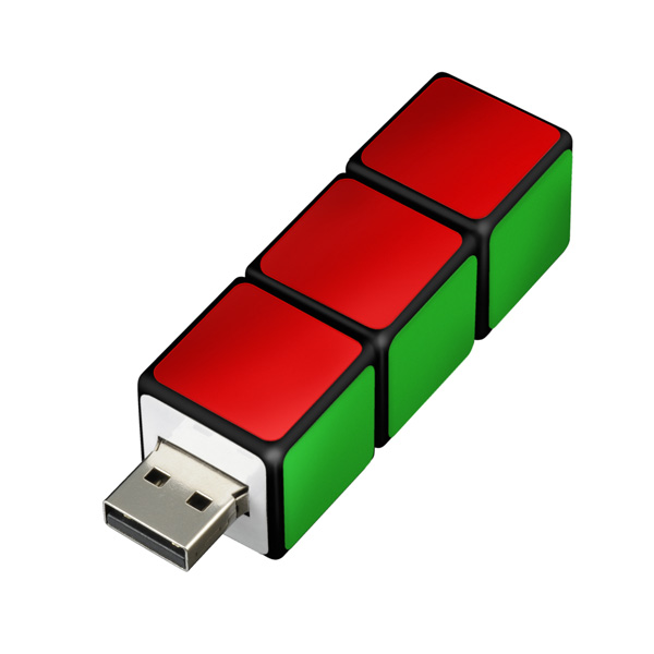 キューブを3つ連結した形のUSBメモリ。最後尾のキューブを捻ることで、先頭のキューブからUSB端子が飛び出すギミックになっている。本体サイズは61.8(幅)×20.7(高さ)×20.7(奥行)mmで、重量は約17.5g。