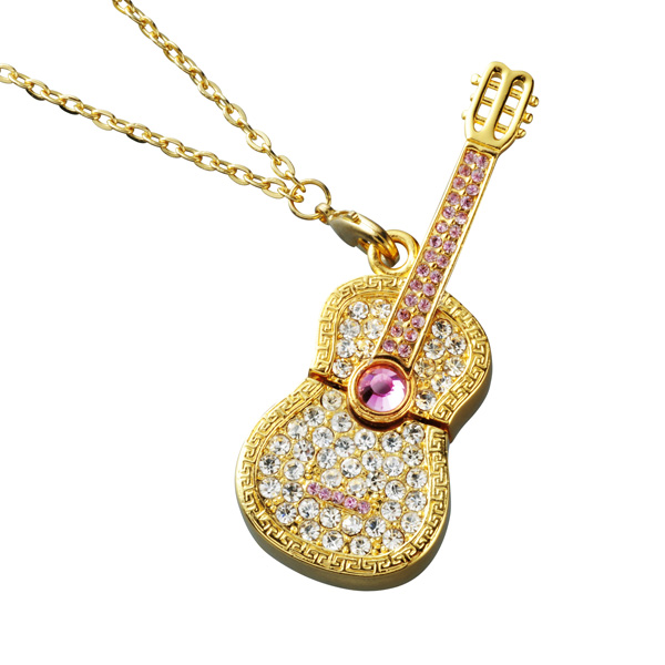 アコースティックギターを模した形のUSBメモリで、ラインストーンを散りばめたデコレーションも特徴的。使用の際には、上下が分割してUSB端子を出現させるスタイルとなっている。本体サイズは73(幅)×11(高さ)×28.6(奥行)mmで、重量は約56.7g。
