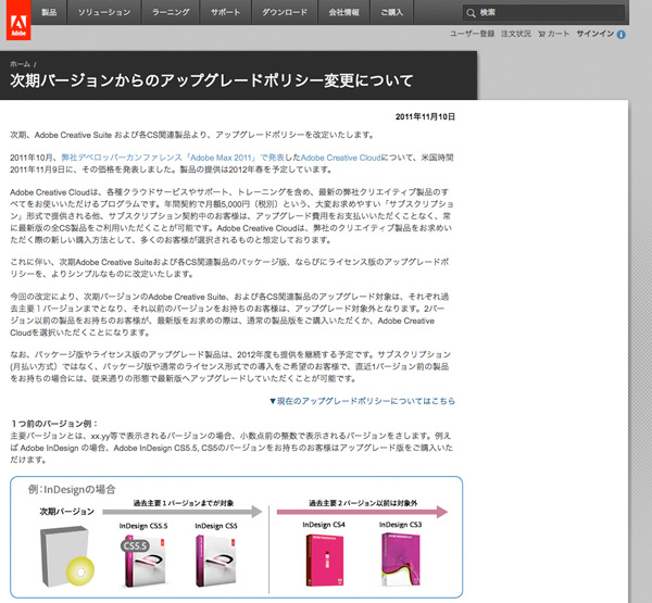 新たなアップグレードポリシーによって、現在では過去主要3バージョンまでとなっているアップグレード元の対象が直近1バージョンまでに変更。それ以前のバージョンはアップグレード対象外となり、最新版の導入の際には、通常の製品版を購入するか、「Adobe Creative Cloud」を選択することとなる。