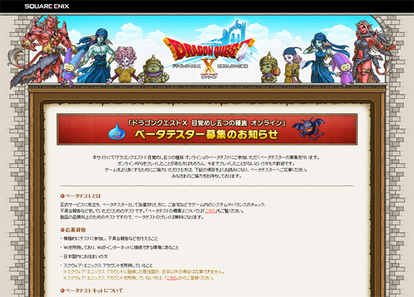 (株)スクウェア・エニックスは、「ドラゴンクエストX 目覚めし五つの種族 オンライン」βテスターの募集を開始した。発売は2012年の予定。