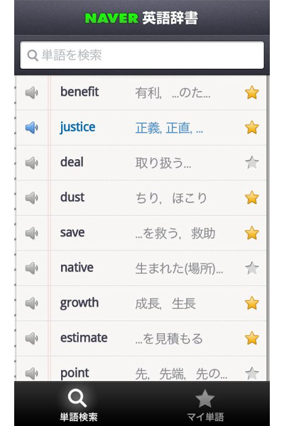 検索した単語の履歴は最大100件まで保存可能。検索窓に文字を入力すると予測変換で候補を表示する機能や、単語や例文の発音再生機能、お気に入りの単語を「マイ単語」として保存できる機能なども搭載する。