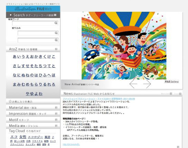 同サイトは、「イラストレーションファイル2011」掲載ページの画像データで各作家の作風などが確認できるほか、未発表のオリジナル作品、最新の仕事情報、展覧会情報の閲覧ができるサイト。すべての作品画像には、技法・作品の印象・モチーフ・使用メディアに関するタグ(キーワード)が付けられ、それらをワード検索するか、TOPページに表示されているタグクラウドを選択することで検索できる。もちろん、イラストレーターの名前で検索することも可能だ。