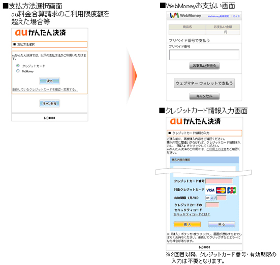 auかんたん決済とは、au one-IDを登録することでauのスマートフォンやPCで購入したコンテンツ料金・商品代金を通話料金と合算して支払うことができるサービス。au料金合算請求の利用限度額を超えた場合などに、WebMoneyもしくはクレジットカードが利用できるようになる。手数料は無料。