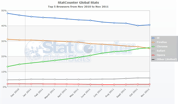 2011年11月時点のFirefoxのシェアは25.23%。対してGoogle Cromeは25.69%とリードした。なおInternet Explorerのシェアは40.63%と、高いシェアを誇っている。