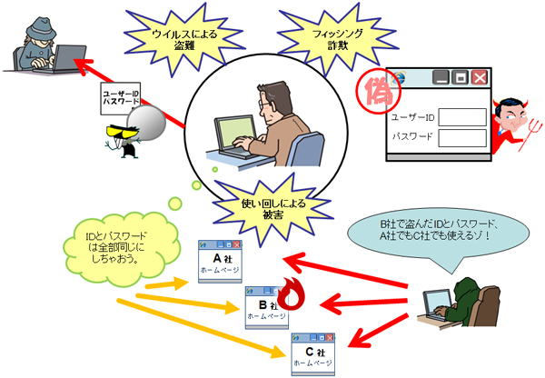 同社は2011年11月に発生した大手インターネットショッピングサービスでの大規模な不正利用事件などを例に挙げ、不正利用された原因としてID・パスワードが窃取されて悪用された可能性が高いと述べている。窃取された具体的な理由として「ウイルス感染」「フィッシング詐欺」「ID・パスワードの使いまわし」などを紹介するとともに、対策として「ウイルス対策ソフトの導入やOS・アプリケーションの脆弱性解消」「メールを簡単に開かない・クリックしない」「フィッシング対策」「ID・パスワードの適切な管理と利用サイトの確認」「被害に遭ったらクレジットカード会社とインターネットサービス事業者に不当請求であることを報告および消費生活センターに相談」などを挙げている。