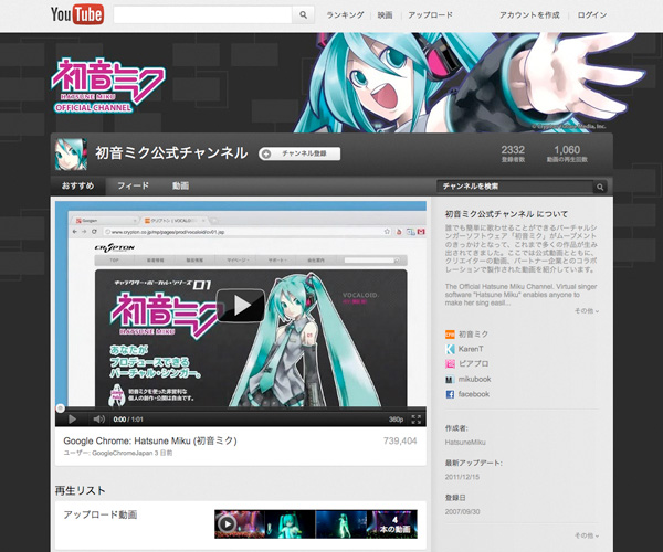 クリプトン・フューチャー・メディア株式会社は、YouTubeに合成音声ソフト「初音ミク」の公式チャンネル(http://www.youtube.com/HatsuneMiku)を開設した。楽曲のクリエイターやファン/リスナーが交流を深めることを目的としたもので、公式動画のほか、クリエイターの動画やパートナー企業とのコラボレーションで制作された動画も紹介される。