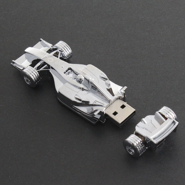 本製品はUSB 2.0/1.1接続に対応するモデルで、シルバーカラーのF1レースカーを模した外観が特徴だ。後輪の部分がキャップになっており、そこを外すことでUSB端子が露出され、PCと接続できる構造となっている。