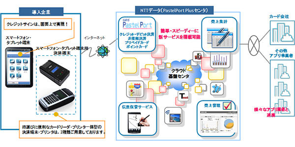 同サービスはスマートフォン・タブレット端末向け決済アプリケーションと決済を行うクラウド型センター「PastelPort Plusセンター」、およびセキュリティ対応の専用カードリーダーから構成されている。スマートフォン・タブレット端末とカードリーダーはBluetoothで通信が行われ、入力されたデータはインターネットを通じてPastelPort Plusセンターに送られたのち決済処理などが完了する仕組みだ。決済アプリケーションは当初はAndroidのみの対応だが、iOSにも対応する予定。これにより催事やイベント会場など、POS端末が常時設置されていない場所でも手軽に各種決済が行えるようになる。
