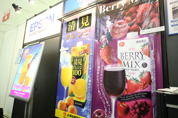 「GS6000」で制作された採用事例。エプソンのブースでは、高度な色再現力を発揮する「MAXART」シリーズで出力したサンプルを数多く見られるほか、自動測色やDICカラーの特色再現などの実演を体験できる