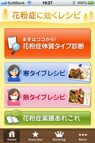 同アプリは花粉症の症状改善や対策に効果の高い薬膳レシピを60点収録したアプリ。体質診断を行うことで、各ユーザーの体質に合わせて効果的なレシピを紹介する。手軽に入手できる食材を使って、ご飯ものやおかず、お茶、スープなど簡単に作れておいしいレシピを収録している。