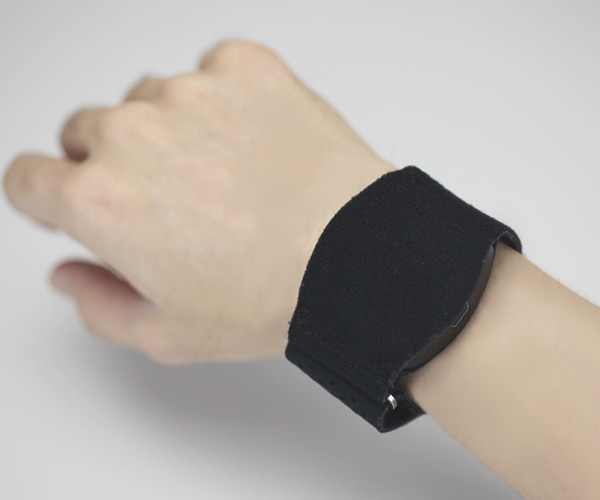 センサーとiPhone/iPad/iPod touchとの接続はBluetooth。センサー本体は約42(幅)×44(高さ)×11(奥行)mm/約18g、アームバンドは約13〜25cmほどの調整が可能でバンド幅は約34mm、クレードルは約102(幅)×35(高さ)×95(奥行)mm/約180gとなっている。