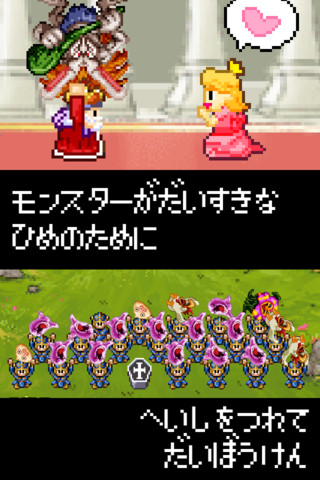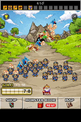 同アプリは短時間で遊べるように設計されたRPGで、アイテムやフォントなどさまざまな要素を懐かしいドット絵で表現している。モンスター好きの姫にために王様が兵士を引き連れてモンスター集めの旅に出るというストーリーで、王様が「出撃」を命じると洞窟や神殿に向かって兵士が突撃する。兵士たちがモンスターを集めて戻ってきたら、指でなぞると兵士たちがモンスターを放り投げるので回収。集めたモンスターとお金(ゴールド)を回収する。
