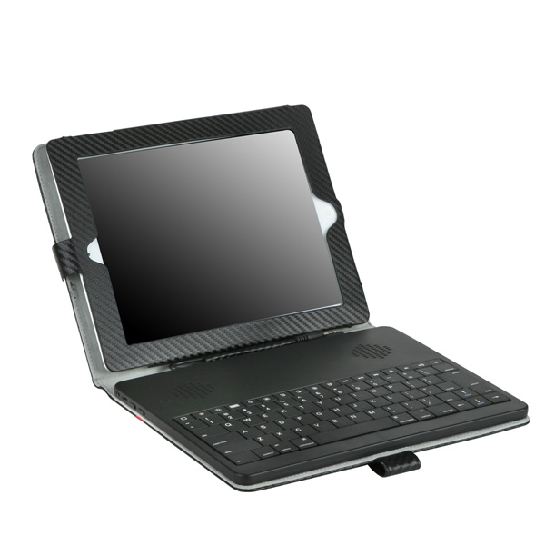 本製品は、プラスティック製のBluetooth接続キーボードが一体化されたカーボン調柄のソフトケースで、キーボード部にはスピーカーも内蔵(音声は別途ケーブル接続)。キーボードはケースから取り外して使用することもできる。ケースはマグネット内蔵で、ワンアクションでスタンドとして展開でき、iPad 2をノートPC風の操作感で扱うことが可能。充電時間は2〜2.5時間で、連続使用時間は約120時間となっている。