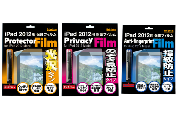 タッチペン付きの液晶保護フィルム。光沢タイプの「Protector Film for iPad 2012」、覗き見防止タイプの「Privacy Film for iPad 2012」、指紋防止タイプの「Anti-fingerprint Film for iPad」の3種が用意されている。