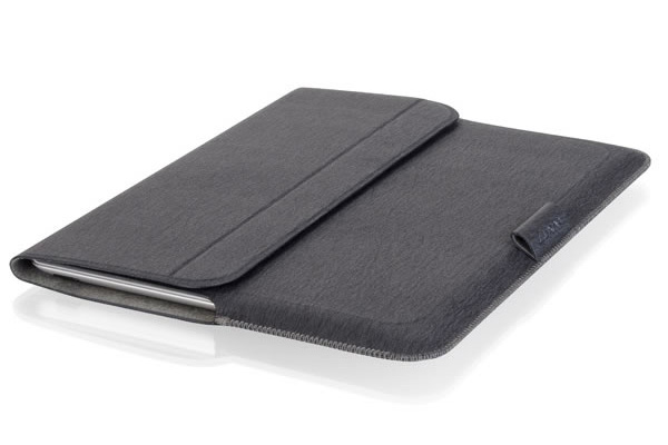 The new iPad/iPad 2/iPadに対応するスリーブケースで、スタンドとしての使用も可能。外側に合皮、内側にマイクロファイバーが用いられており、厚さ約3.3mmの薄型設計となっている。カラーバリエーションはグレー(158g)/ブラック(174g)の2色で、市場予想価格は各3980円前後。