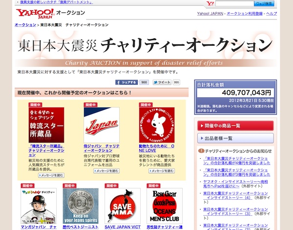 Yahooの「東日本大震災チャリティーオークション」、合計落札額が4億円を突破