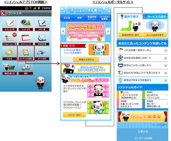 同サービスは携帯電話が執事やコンシェルジュのようにユーザーをサポートするサービスで、従来はiモード携帯電話向けに提供されていたが、このたびスマートフォンにも対応した。「iコンシェルアプリ」や「スケジュール&メモアプリ」、「トルカアプリ」、「オートGPSアプリ」など10種類のアプリをインストールまたはアップデートすることで利用可能となる。インフォメーションやスケジュールの自動更新や、「ドコモ地図ナビ」など他アプリとの連携などが可能だ。月額料金は105円。