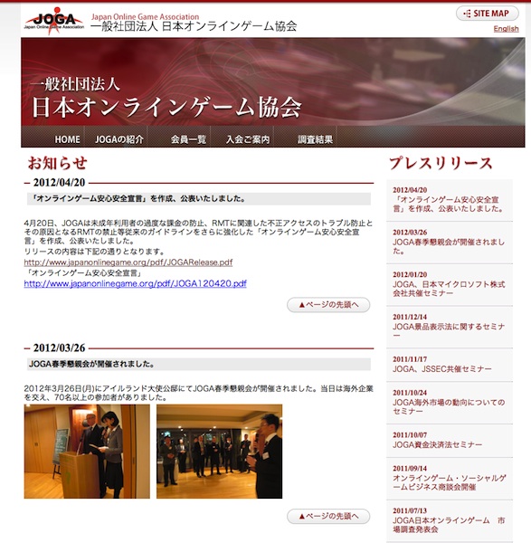 また、ゲームの無料/有料の区別を明確化し誤解を招くような広告や宣伝を行わないよう努めるとしている。RMTについては、不正アクセスに対するセキュリティ対策を強化し、ユーザーがトラブルに巻き込まれないよう防止策を講じていく。今後は、各会員企業の取り組みを確認できる「JOGA 安心安全宣言ホームページ」を2012年5月下旬に公開する予定だ。