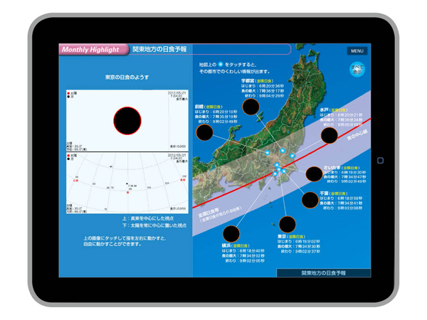 同アプリは動画や音声ナレーション、指でさわって動かせる図などとともに楽しめるデジタル科学マガジン。キーワード検索を行うこともできる。創刊号ではDNAについて特集しているほか、2012年5月21日に日本各地で観測できる金環日食についての解説も掲載。時事通信社から配信される最新の科学・技術・医療ニュースを読むことも可能だ。