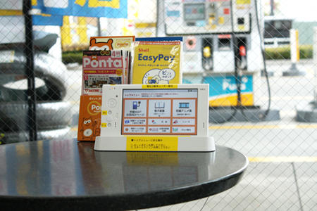 昭和シェル石油は電気自動車向け充電拠点のネットワーク「EVサービスステーション・ネットワーク」に参加しており、待機時間を要する電気自動車への充電中に電子マガジンや天気・交通情報を楽しんでもらうことを目的に、現在10カ所のサービスステーションで提供中だ。