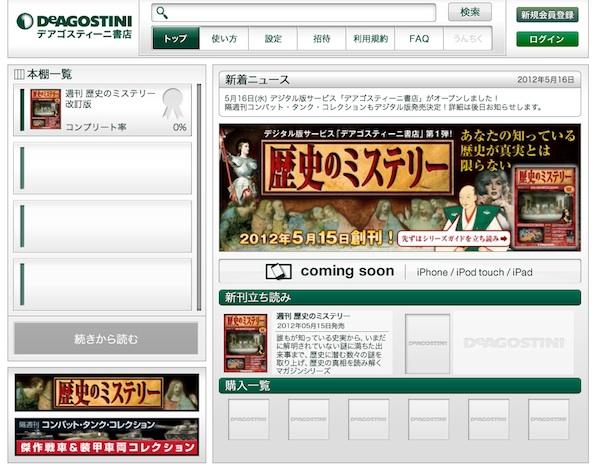 株式会社デアゴスティーニ・ジャパンは、同社の出版物のデジタル版を購入できるパソコン向け電子書籍ストア「デアゴスティーニ書店」をリリースした。第一弾として「週刊 歴史のミステリー」シリーズを販売中だ。タブレット対応版、スマートフォン対応版も近日リリース予定。