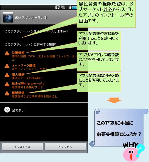 また、アプリを起動すると端末の情報やアドレス帳の内容を収集。不審なサイト宛に端末の情報を送信していた。対策として、アプリのインストール時に表示される権限の内容を注意深く確認すること、アプリは信頼できる場所から入手することを呼びかけている。