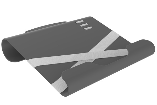 同製品は寝ころびながら操作ができるように傾斜がつけられているほか、手前には開いた本のページやPCがずれないようにストッパーを装備。ストッパーが不要な場合は裏面を使用することも可能だ。本やPCが挟めるクロス型の伸縮性ストラップも用意されている。右上にはゴム製の3つのペンホルダーもあり。