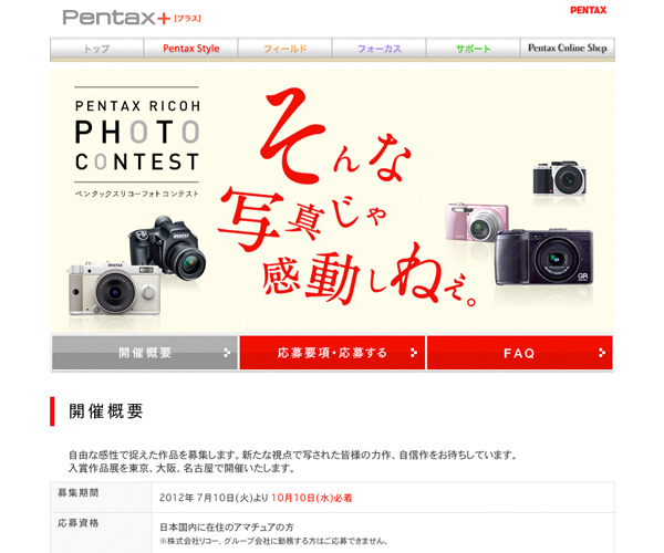 ペンタックスリコーイメージング株式会社によるフォトコンテストで、ペンタックスとリコーのコンシューマー向けカメラ関連事業の集約を記念して開催される。2011年1月以降にペンタックス/リコーブランドのカメラで撮影された未発表作品の募集。デジタル/フィルムカメラのいずれでも可。入賞作品(全62点)は、ペンタックスフォーラム(新宿)やリコーフォトギャラリーRING CUBE(銀座)などでの展示を予定。