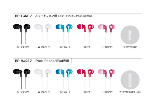 両モデルはiPhoneなどに対応したインサイドホン。マイク付きリモコンを搭載し、手元のスイッチで音楽の再生や一時停止・曲のスキップなどの各種操作が行えるほか、iPhoneではハンズフリー通話も可能。また、RP-HJC17は防滴仕様なので雨や汗からもリモコンを守ることができる。このほか、密閉型を採用しているので音漏れの軽減を実現した。カラーは両モデルともにブラック/ホワイト/レッド/ピンク/ブルーの5色展開。