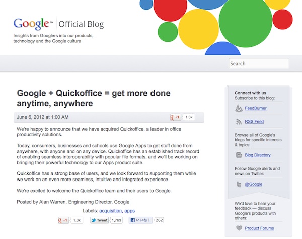 Quickofficeはモバイル端末上でWordやExcelなどのドキュメントを作成/編集/閲覧できるアプリケーション。買収額などの詳細は発表されていないが、エンジニアリングディレクターのAlan Warren氏が「Quickofficeは広く利用されているファイル形式に対し、シームレスな互換性を実現した実績をもつ。この強力な技術をGoogle Appsにも取り入れて行く」と同社の公式ブログにおいてコメントしている。