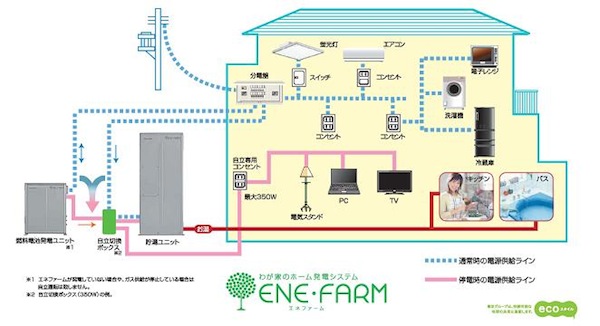 また、自立切換ボックスを設置することで、停電時でも給湯機(貯湯ユニット)の電源を商用電源のコンセントからエネファーム側につなぎ換える必要がなしに、そのまま給湯できる。