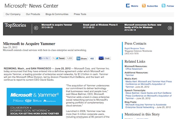米Microsoftは、企業向けSNSを提供する米Yammerと買収について合意したと発表した。買収額は12億ドル。