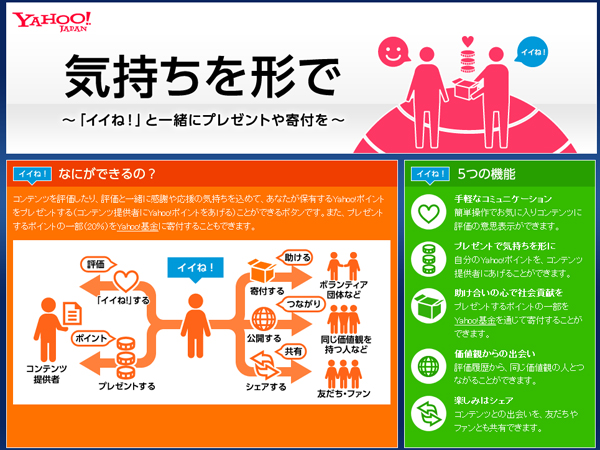 ヤフー株式会社は、Yahoo!ポイントのプレゼント機能などを備えたYahoo! JAPAN専用「イイね!」ボタンを「Yahoo!ブログ」導入開始した。7月に「Yahoo!ロコ」、8月に「Yahoo!知恵袋」への導入が予定されている。