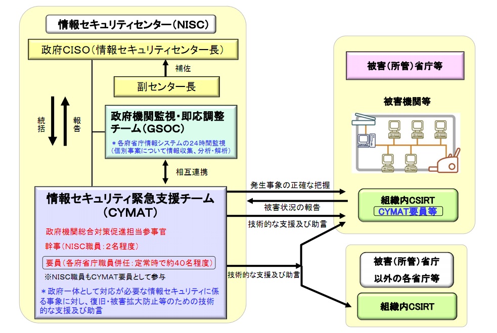 内閣官房情報セキュリティセンター(NISC)は、府省庁の壁を越えてサイバー攻撃などの対策を支援するため「情報セキュリティ緊急支援チーム(CYMAT)」を設置した。