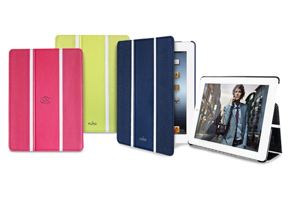 iPad用の新製品は、ブラック/シルバー/ゴールドの3色が用意された「PURO New iPad BOOKCM」と、グリーン/ブルー/ピンク/ブラックの4色が用意された「PURO New iPad Golf Fluo Cases」。いずれも直販価格は各5980円で、スタンド機能/開閉によるスリープ制御機能付きのフラップカバーとなっている。対応機種は新しいiPad(2012年3月発売モデル)およびiPad 2。