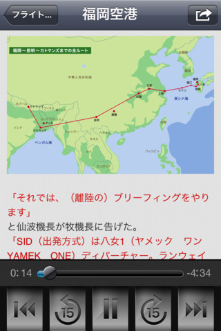 同アプリは航空機録音のスペシャリストである武田一男氏がプロデュースしたアプリ。福岡空港を離陸し、カトマンズ・トリブバン空港に着陸するまでの操縦席の様子を収録しており、約2時間30分の貴重な生音を聴ける。音声を聴きながら交信音声等をテキストに起こした解説を確認することが可能だ。