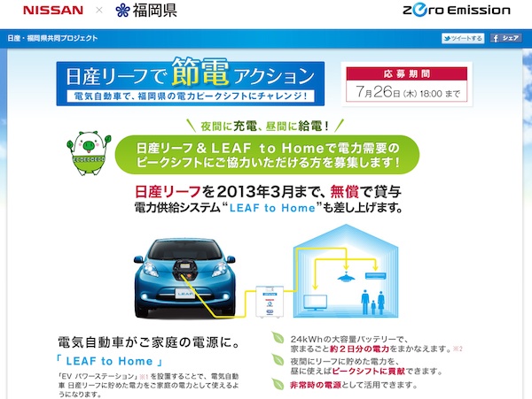 日産自動車株式会社は福岡県と共同で、電力供給システム「LEAF to Home」を利用した節電対策「日産リーフで節電アクション」を実施し、福岡県での電力安定供給に貢献することを発表した。