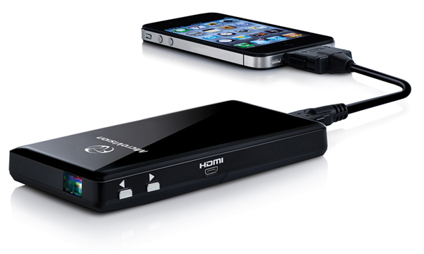 同製品はサイズが高さ118mm×幅60mm×厚さ14mm、重さ117gと小型・軽量の小型プロジェクタ。848×480ドットで出力でき、最大100インチまで投影可能。明るさ15ルーメン、コントラスト比5000:1となっている。iPod/iPhone/iPadとの接続用専用ケーブルに加えてHDMIも付属しており、高画質の動画を楽しむことが可能。フル充電で約2時間再生可能なバッテリーを内蔵している。