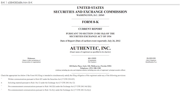米アップルが指紋認証技術を開発している米AuthenTecを買収することが、米証券取引委員会に提出された書類(FORM 8-K)で明らかになった。
