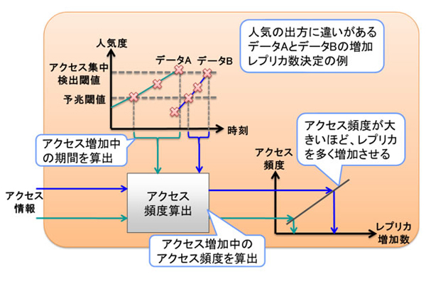 同技術は分散ストレージにおいて突発的に人気が出たデータを即座に検出し、そのレプリカを持つサーバ数を増加させることでアクセスを分散させる技術。アクセス集中が起きた人気データを少ないメモリ量で推定する人気度推定エンジンと、レプリカ数を適切に増減させるアクセス集中度分析技術の2つで構成される。