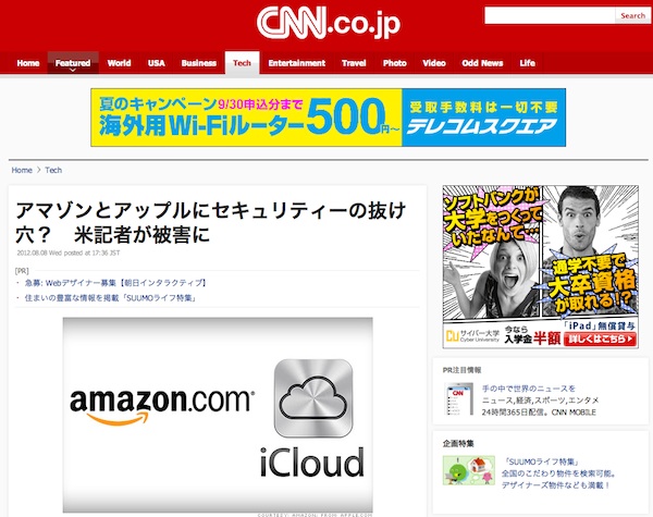 CNN(2012年8月8日付)の報道によると、米テクノロジ情報サイト記者であるMat Honan氏のApple IDのアカウントがハッキング被害を受けた問題で、アップル社が電話によるパスワードリセットの受付けを停止した。このハッキングで同氏のAmazonアカウントも被害を受けており、Amazonもセキュリティを見直しているという。