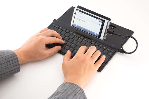 同製品はスマートフォンとmicroUSBケーブルで接続。さらに給電はスマートフォンから行うため、本体の充電や接続設定を行う必要がない。また、テキストのコピー・ペーストやオーディオコントロールが行える16個の専用ホットキーを搭載しており、快適に入力できるのも特徴だ。スマートフォンが立てられるスタンド機能も用意されている。サイズはおよそ幅244mm×高さ17mm×奥行き113mm、重さ約250g。持ち運びに便利な専用ポーチも付属している。