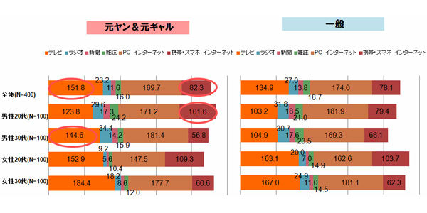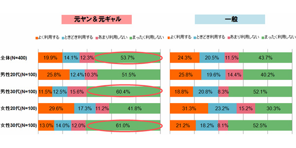 調査によると、元ヤン・元ギャルはテレビと携帯・スマホでのインターネットの接触時間が長く、特に30代の男性はテレビで40分、携帯・スマホでのインターネットで22分も一般を上回った。また、元ヤン・元ギャルはソーシャルネットワークサービスをまったく利用しない比率が高く、30代は男女とも6割が利用していないという結果になった。そのほかの詳細はWebで確認してほしい。