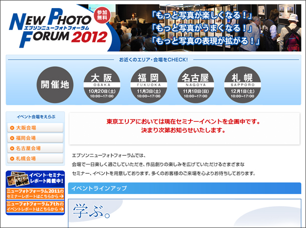 写真愛好家の方のデジタル環境での作品づくりを支援することを目的に企画したエプソンのフォトイベント。2004年から毎年開催しており、今回は大阪・福岡・名古屋・札幌で開催を告知したもの。なお、東京エリアについては現在セミナーイベントを企画中。