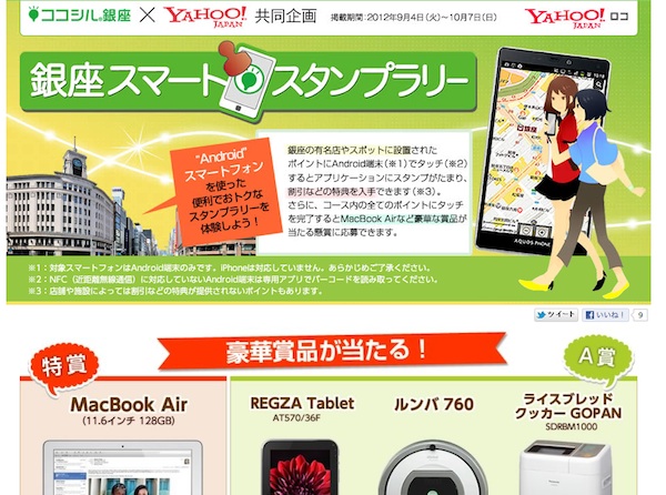 ユーシーテクノロジ株式会社ととヤフー株式会は、銀座エリアを中心にインターネットとリアル店舗を結ぶO2O(オンライン・トゥ・オフライン)実証実験「銀座スマートスタンプラリー」を2012年10月7日(日)まで実施する。