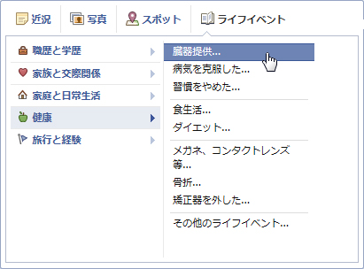 Facebookは、社団法人日本臓器移植ネットワークとの協力のもと、Facebookのタイムライン上で臓器提供の意思表示が共有できる機能を追加した。