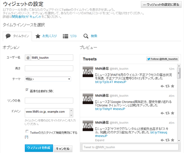 [新規作成]ボタンを押すと、以下のような設定画面が表示されます。「タイムライン」「お気に入り」「リスト」「検索」とそれぞれに関する埋め込みタイムラインが作成できますが、ここでは通常のタイムラインを作成します。左側の「オプション」にある項目を変更してカスタマイズしていきます。カスタマイズした結果は右側のプレビューで確認が可能。オプションの項目は以下の通りです。設定が終わったら[ウィジェットを作成]ボタンをクリックします。